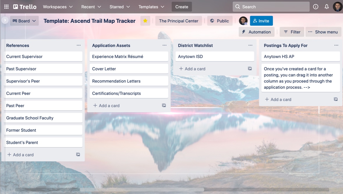 The Ascend Trail Map Tracker is a Trello board for keeping track of each job you're applying for, as well as your application materials, references, and other key elements of your search.